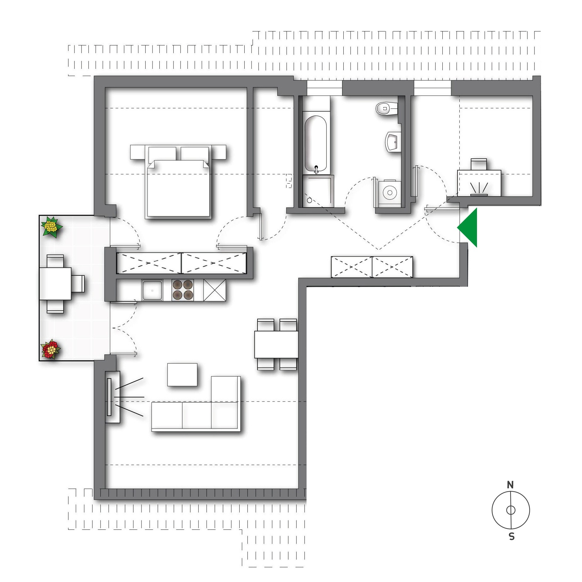 Die Wohnung verfügt über 2,5 Zimmer, darunter ein Schlafzimmer und ein Badezimmer. Das Schlafzimmer bietet genügend Platz für ein Bett und einen Kleiderschrank. Das Badezimmer ist mit einer Dusche, einer Badewanne, einem Waschbecken, einer Toilette und einem Waschmaschinenanschluss ausgestattet. Der offene Wohn- und Essbereich bietet genügend Platz für gemütliche Stunden und lädt zum Entspannen ein.